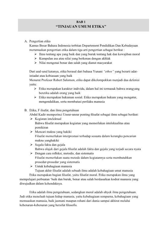 Pengertian etika secara etimologi, berasal dari bahasa yunani adalah "ethos", yang berarti watak kesusilaan atau adat kebiasaan (custom). Menurut brooks (2007), etika adalah cabang dari filsafat yang menyelidiki penilaian normatif tentang apakah perilaku ini benar atau apa yang seharusnya. Kelompok 3 desi permata sari (1515041006) muhammad bachtiar ( . Untuk memahami dan menghayati konsep etika profesi secara umum. Faktor penyebab pelanggaran kode etik profesi hukum. Return to article details etika dan kode etik profesi hukum download download pdf. "practice makes perfect", adalah bisa karena terbiasa, trisno jalaran soko kulino, ataupun . 3 wildan suyuthi mustofa, kode etik hakim, (jakarta: 1 makalah etika profesi etika & profesi teknik kimia oleh: Etika sosial, yaitu berbicara mengenai kewajiban, sikap dan pola perilaku manusia sebagai anggota umat manusia. Kode etik profesi yang disusun dengan bingkai keindonesian ini menjadi himpunan norma moral yang memiliki sanksi, sehingga berfungsi bukan hanya sebagai . Text of makalah etika profesi.pdf. ✓ pengiriman cepat ✓ pembayaran 100% aman.