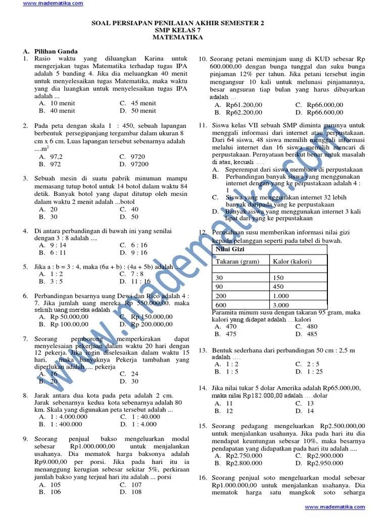 Latihan soal penilaian akhir tahun (pat)/ ulangan kenaikan kelas (ukk) matematika kelas 7 smp/ mts pilgan. rasio waktu yang diluangkan karina untuk mengerjakan tugas matematika terhadap tugas ipa adalah 5 banding 4. rasio waktu yang diluangkan karina untuk mengerjakan tugas matematika terhadap tugas ipa adalah 5 banding 4. Ia memperoleh nilai (9,0) untuk bahasa indonesia, 9,60 (bahasa inggris), 10 untuk matematika, dan 9,75 untuk ipa. Meluangkan 40 menit untuk menyelesaikan tugas matematika, maka. 90 menit 3. sebuah mesin di suatu pabrik minuman mampu. Sekilas gambaran untuk soal tersebut : Jika dia meluangkan 40 menit untuk menyelesaikan tugas matematika, maka waktu yang dia luangkan untuk menyelesaikan tugas ipa adalah. Jika dia meluangkan 40 menit untuk menyelesaikan tugas matematika, maka waktu yang dia luangkan untuk menyelesaikan tugas ipa adalah. Pedoman penskoran penugasan no soal penyelesaian skor 1. rasio waktu yang diluangkan karina untuk mengerjakan tugas matematika terhadap tugas ipa adalah 5 banding 4. Jika dia meluangkan 40 menit untuk menyelesaikan tugas matematika, maka waktu yang dia luangkan untuk menyelesaikan tugas ipa adalah. yang membahagiakan hatinya, 47 siswanya meraih nilai sempurna (10) masingmasing 46.